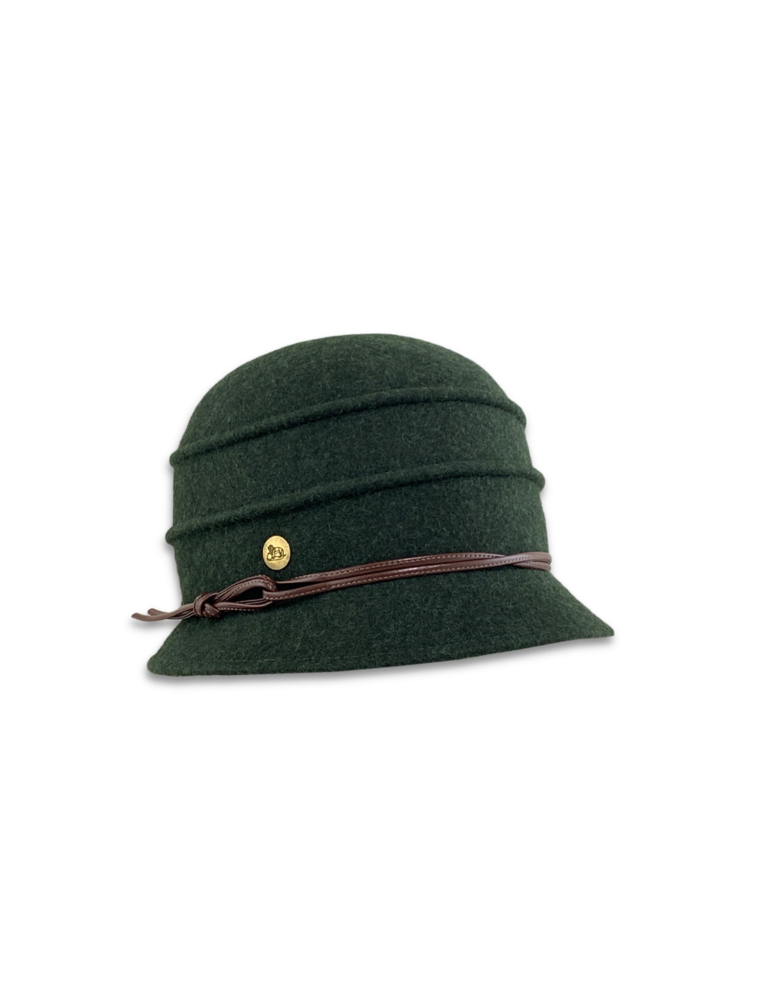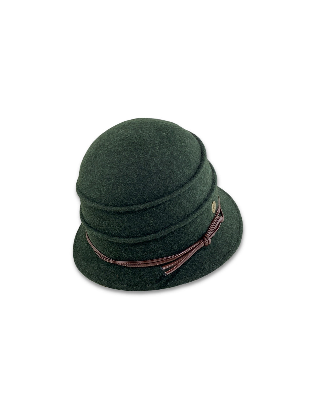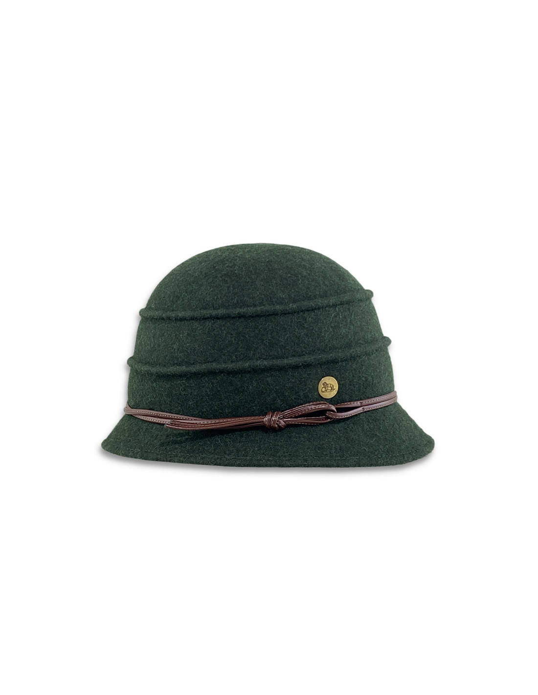 Su diseño clásico, con copa redondeada y ala discreta, se realza con una elegante cinta de piel sintética que culmina en un pequeño lazo y un aplique metálico distintivo.